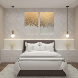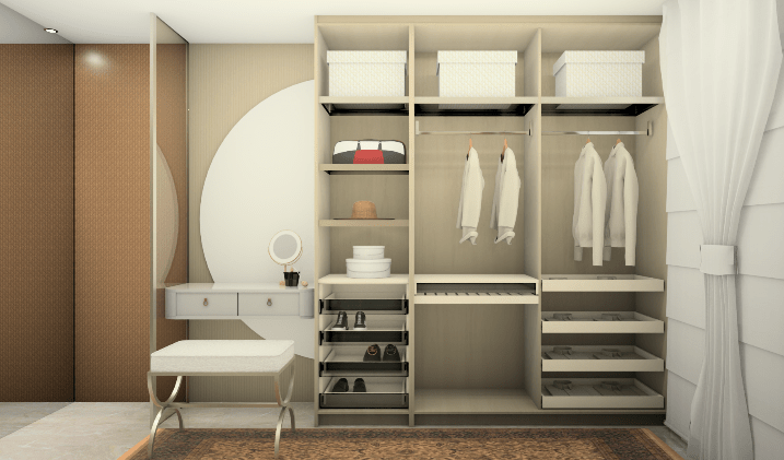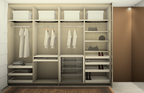 Closet frente ao mar com portas deslizantes na entrada em “Refleta Bronze” proporcionando leveza, transparência e elegância. A configuração personalizada dos armários internos foi desenvolvida para realçar todos os itens ali guardados.