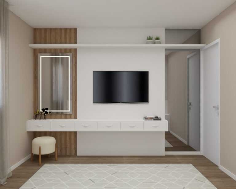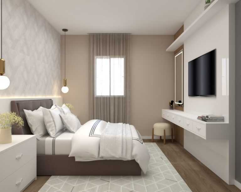 Quarto de uma senhora romântica e delicada com formas modernas e cores neutras trazendo aconchego.